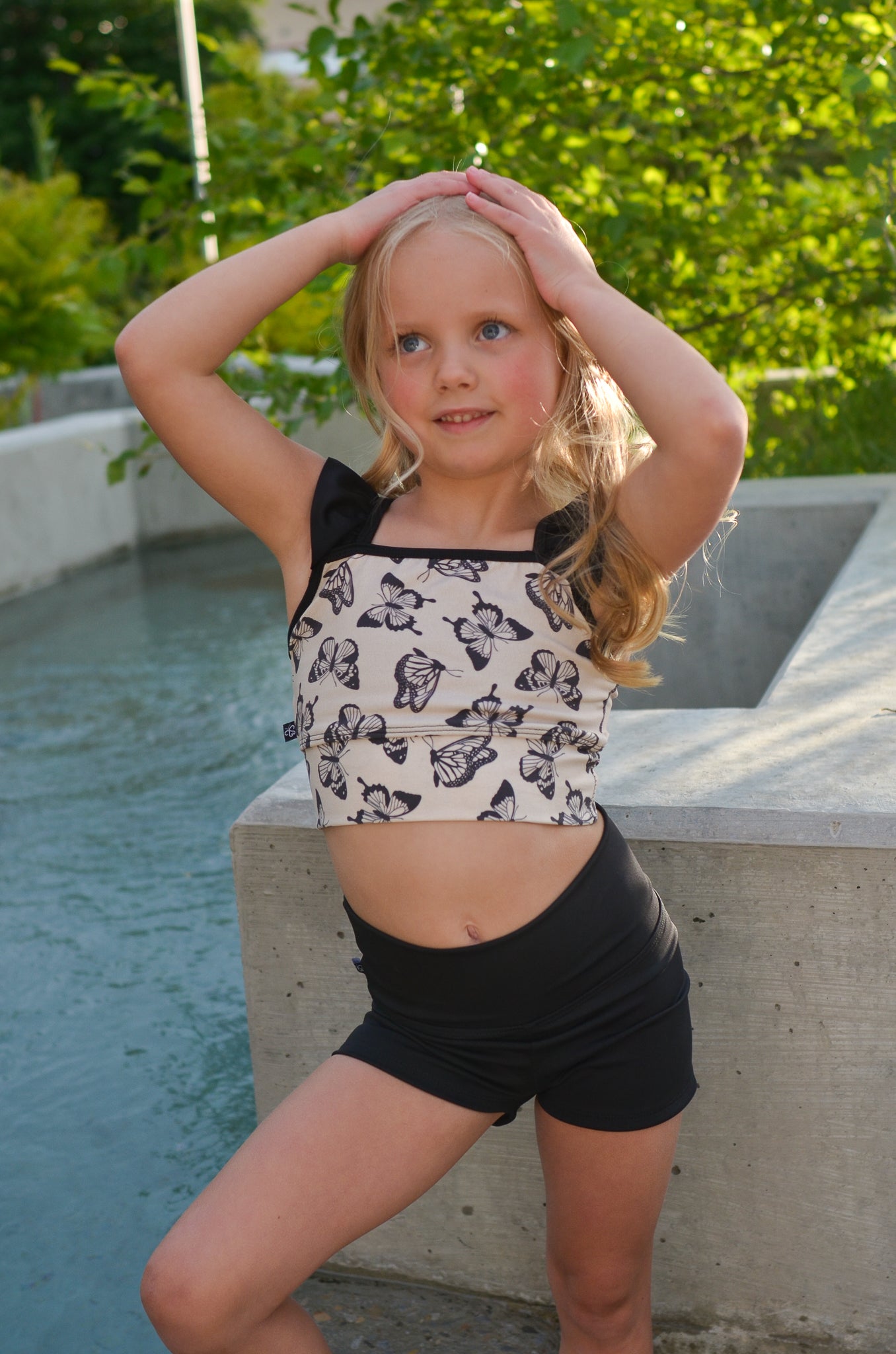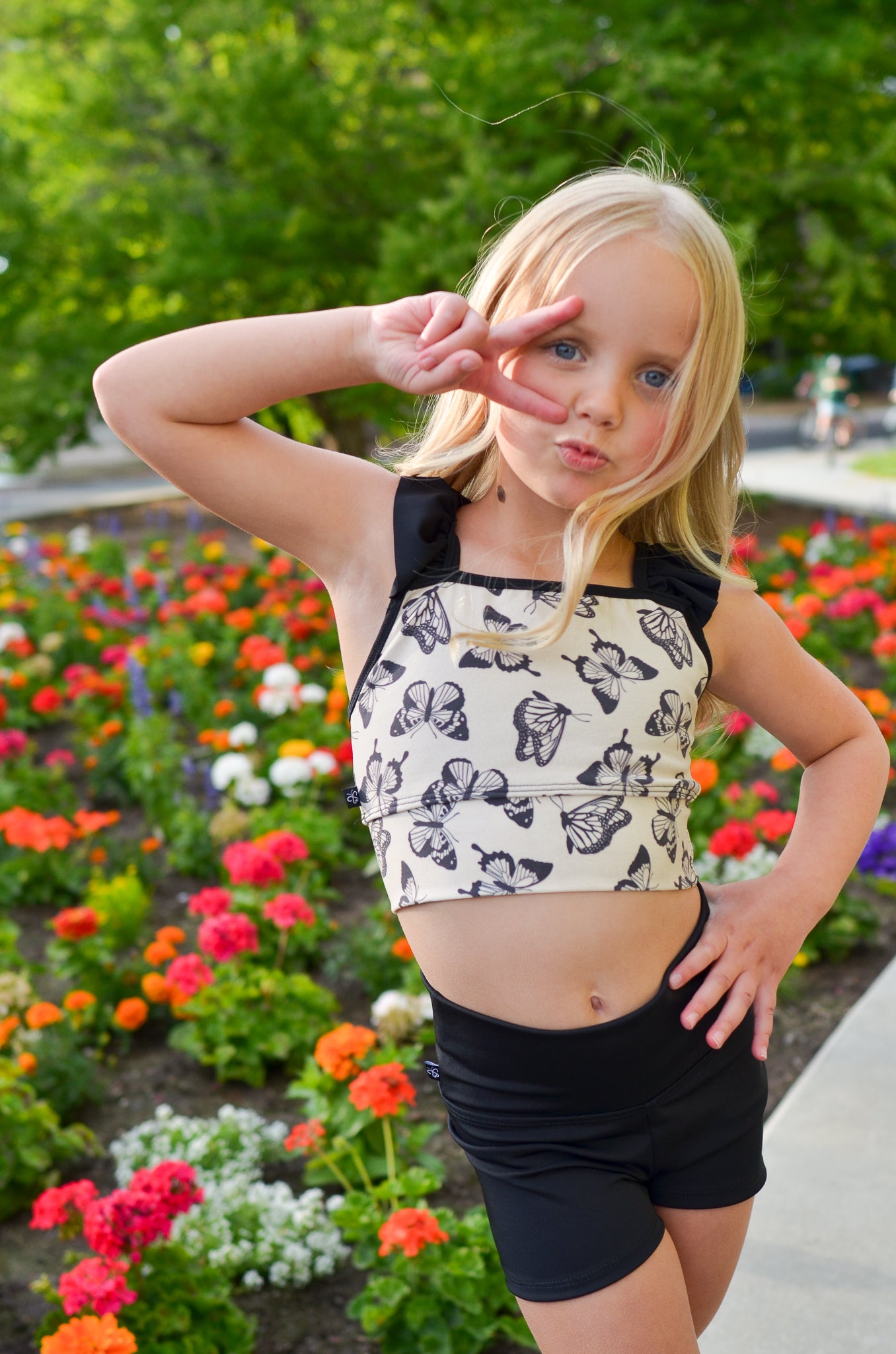 Whimsy takes flight once more in our Flutter Top. Featuring bold black ruffle straps and a stunning cream base sprinkled with graceful black butterflies, this top is a beautiful blend of elegance and playful charm. The deep V-back adds a touch of drama, while the comfortable stretch fabric allows for effortless movement through every plié and pirouette. It’s the perfect pick for the dancer who loves a little magic in every move.